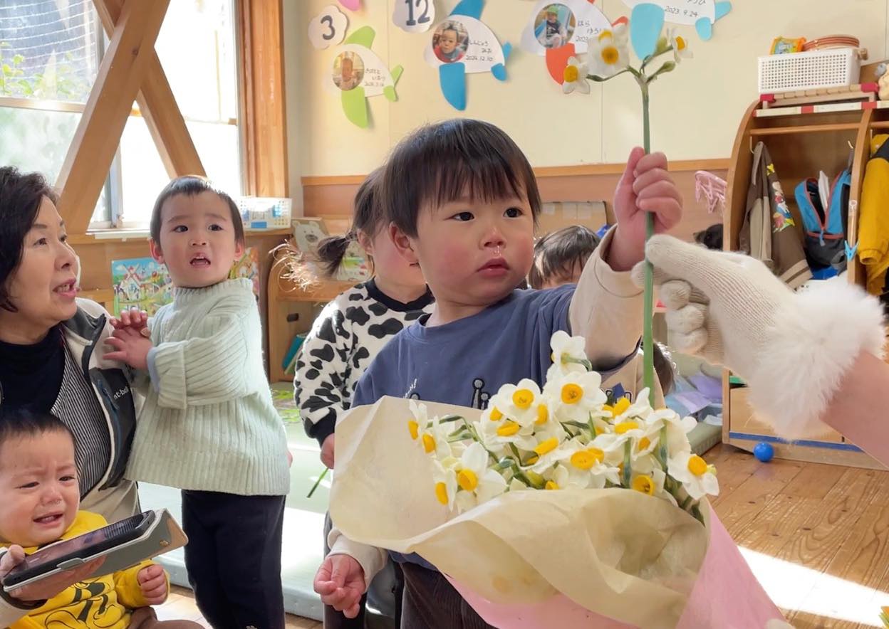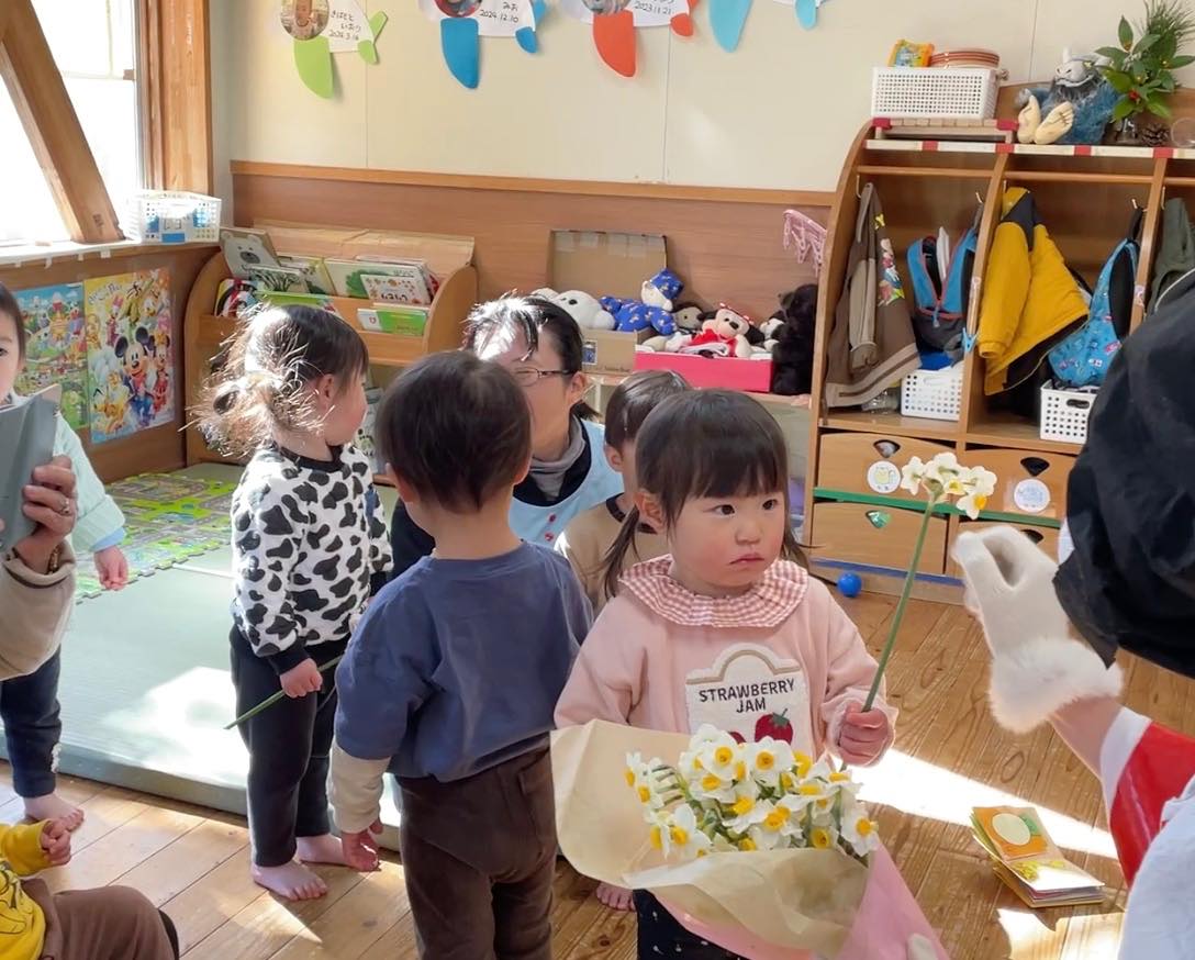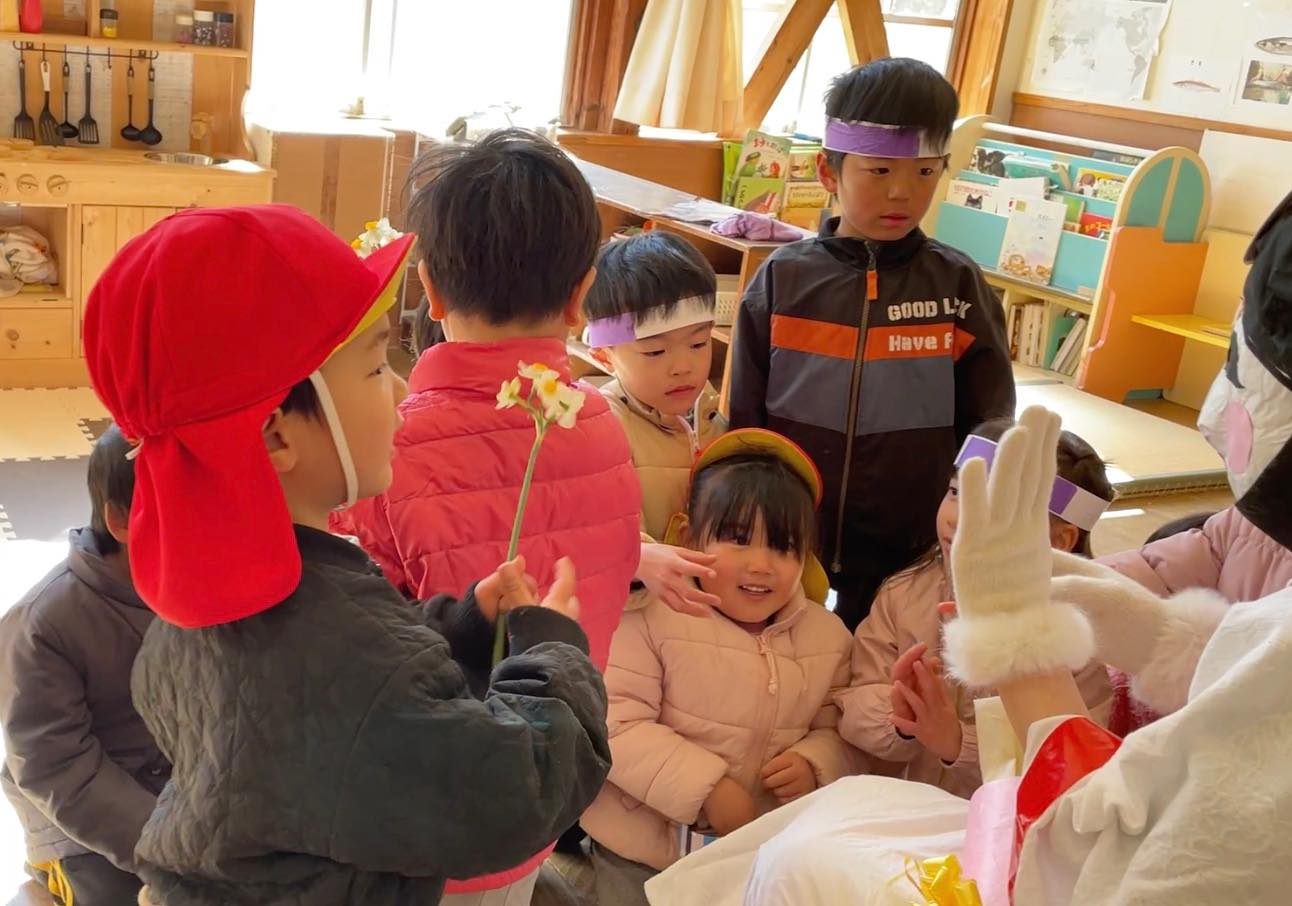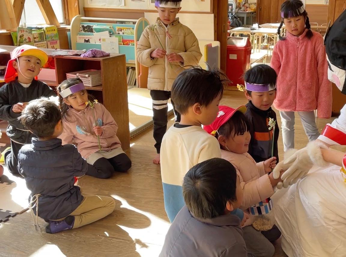 最後には、福の神が舞い降りて、梅の花と水仙の花束。一人一人にお花を一輪ずつ手渡しでくれました。