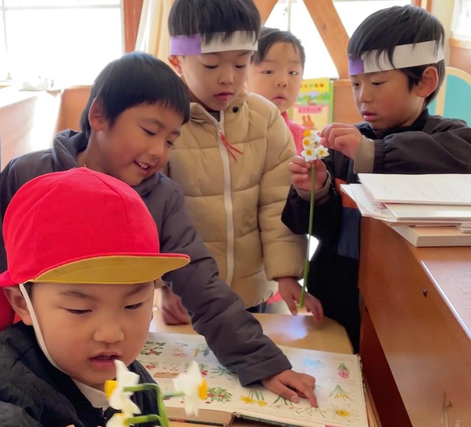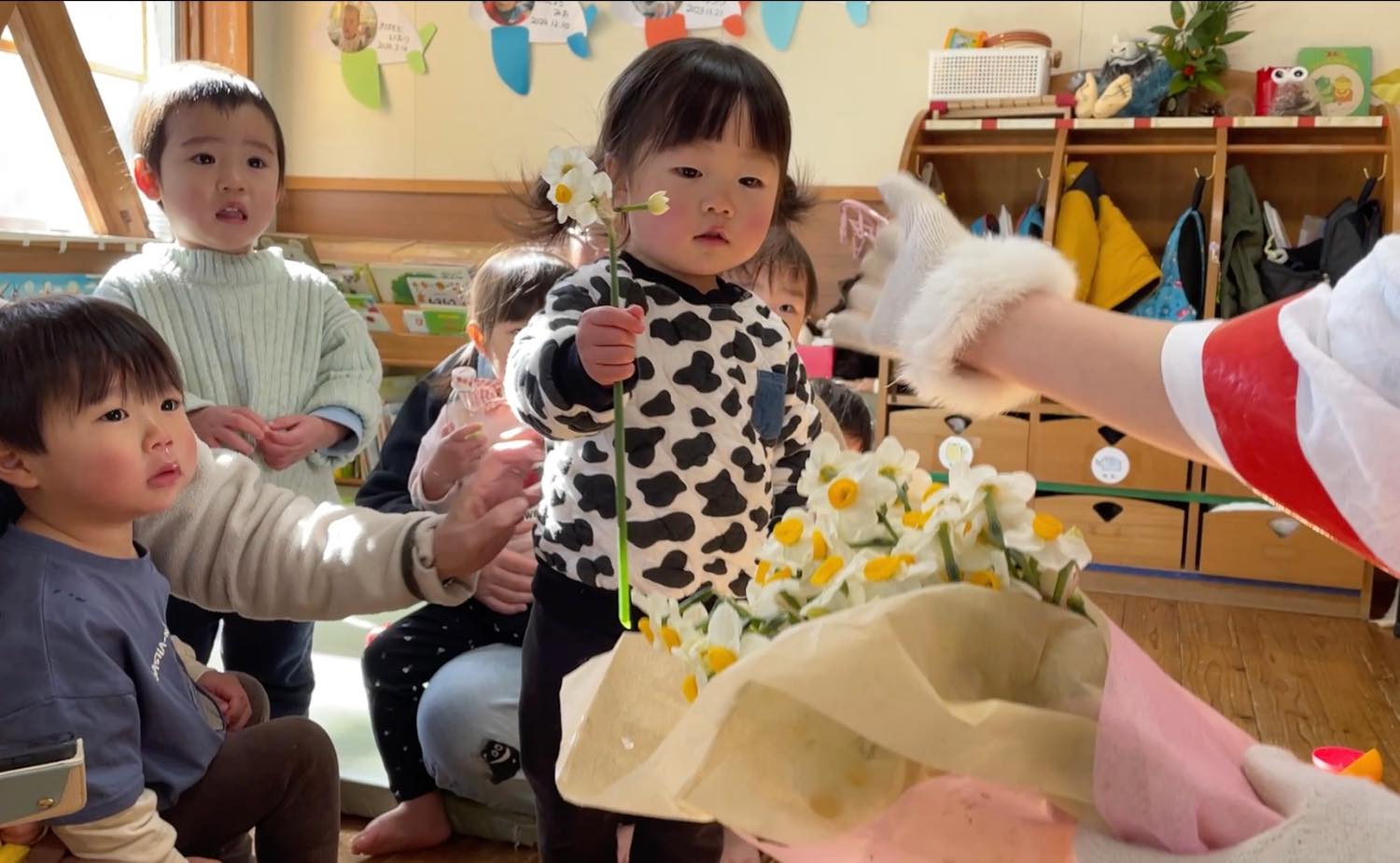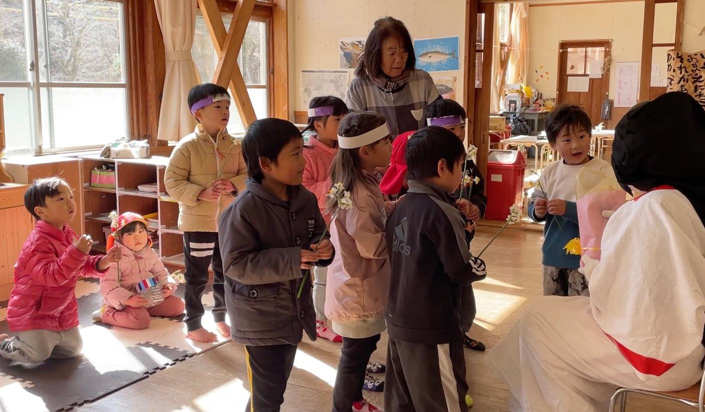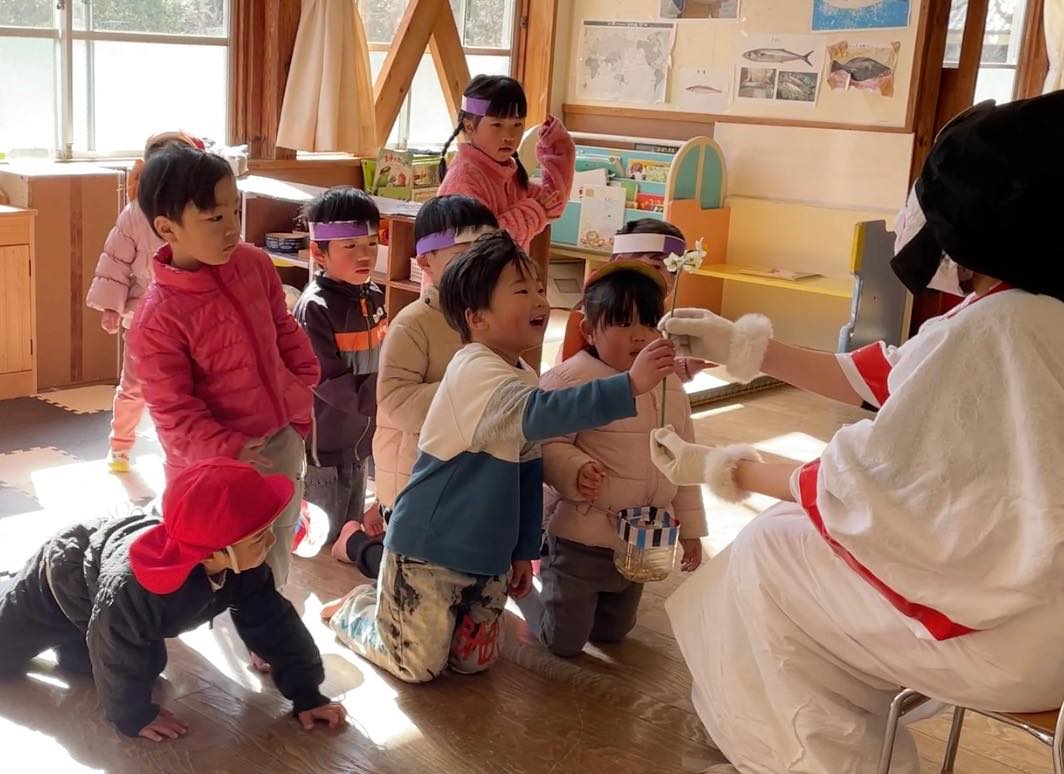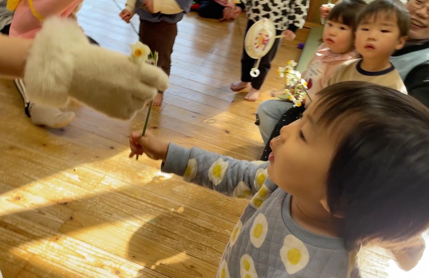 最後には、福の神が舞い降りて、梅の花と水仙の花束。一人一人にお花を一輪ずつ手渡しでくれました。