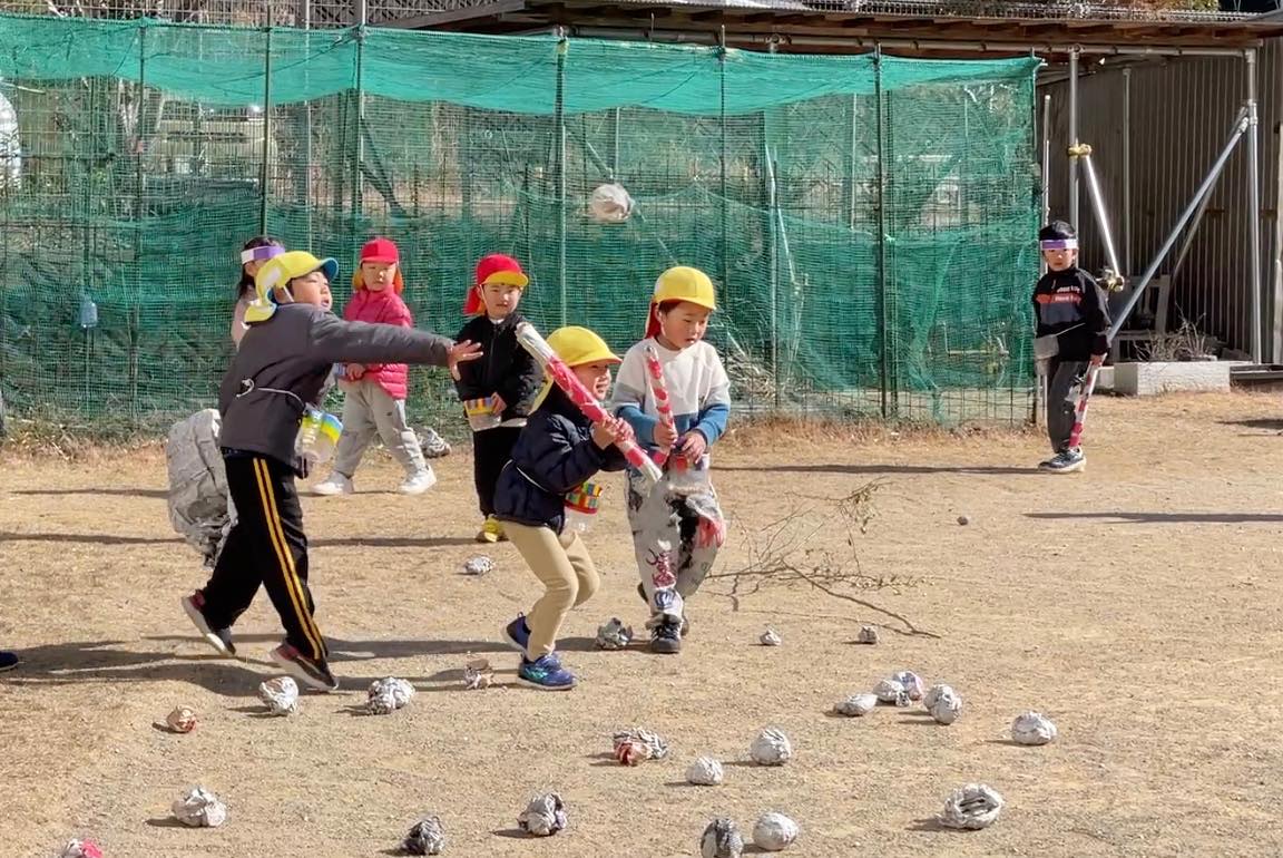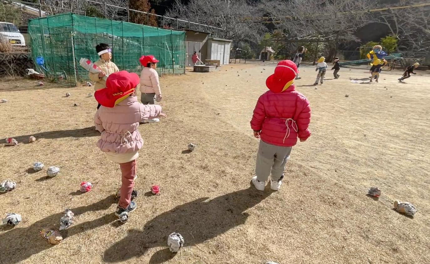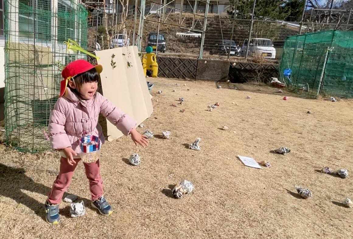 2月3日に向けて、自分たちの心にひそむ鬼を、当日やってきた鬼たちに持っていってもらうということで、いろんな心の鬼を書き留めて丸めました。しかし、鬼に立ち向かうのはなかなか容易ではないので、子どもたちなりの作戦をたてました。