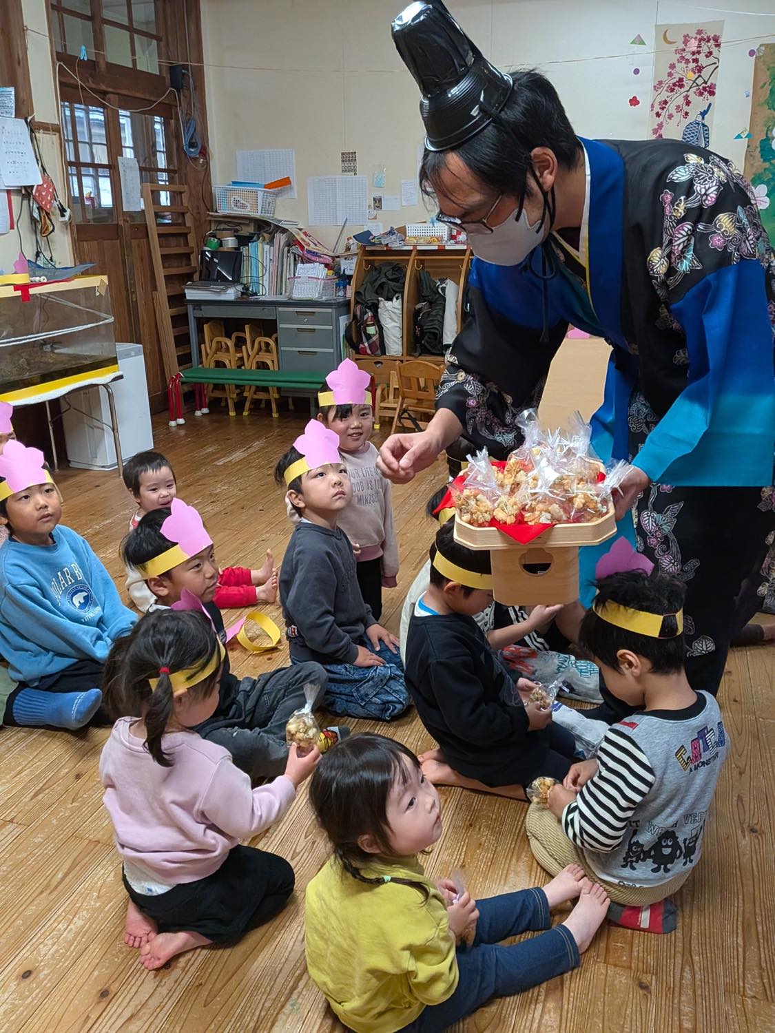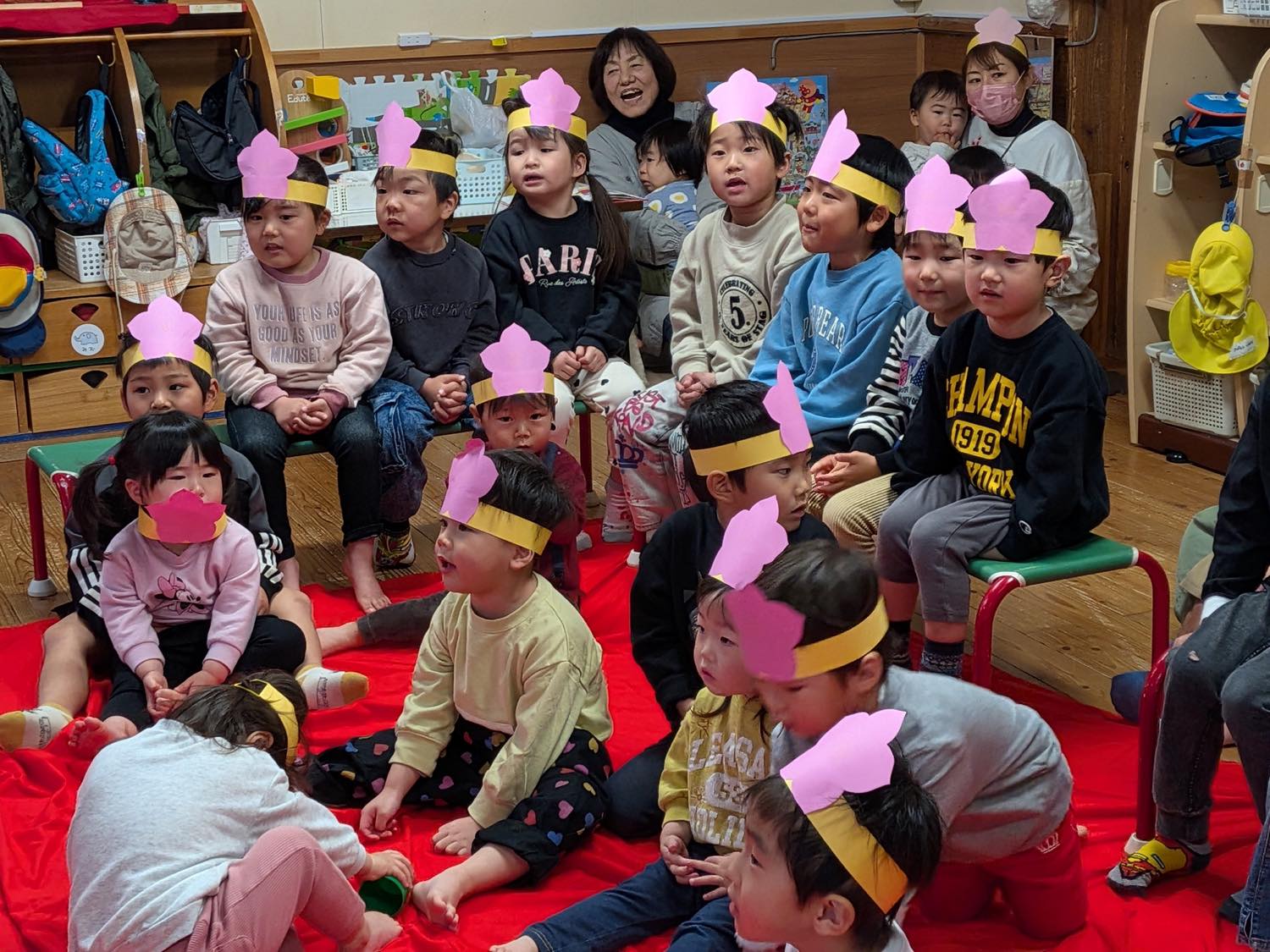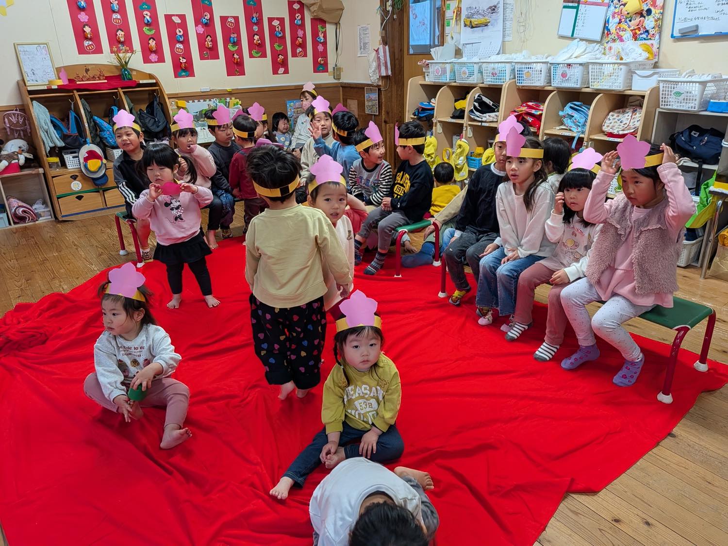 3月3日にひな祭り会をしました。おしゃれした”おひなさま”と、ダンディーな”おだいりさま”が、お囃子と共に子どもたちの前に登場。お雛様の由来などをお話ししながら始まりました。子どもたちからの質問コーナーでは、「なぜ雛壇は7段あるの?」「飾られているお花(木)の名前は?」「五人囃子は何歳ぐらいですか?」などなど。「お雛様はなぜ12枚も着物を着ているの?」の質問にはタジタジ^^;