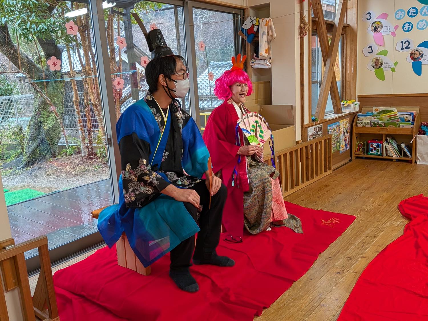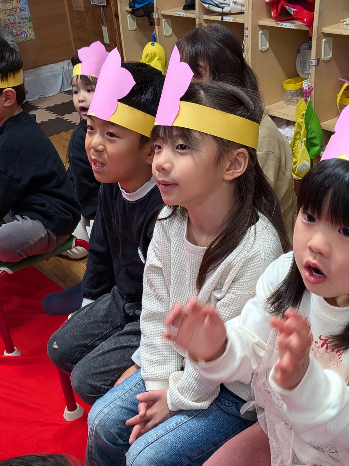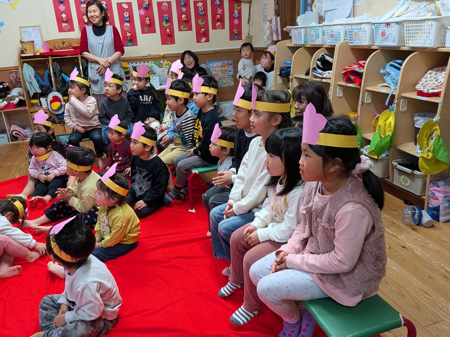 3月3日にひな祭り会をしました。おしゃれした”おひなさま”と、ダンディーな”おだいりさま”が、お囃子と共に子どもたちの前に登場。お雛様の由来などをお話ししながら始まりました。子どもたちからの質問コーナーでは、「なぜ雛壇は7段あるの?」「飾られているお花(木)の名前は?」「五人囃子は何歳ぐらいですか?」などなど。「お雛様はなぜ12枚も着物を着ているの?」の質問にはタジタジ^^;
