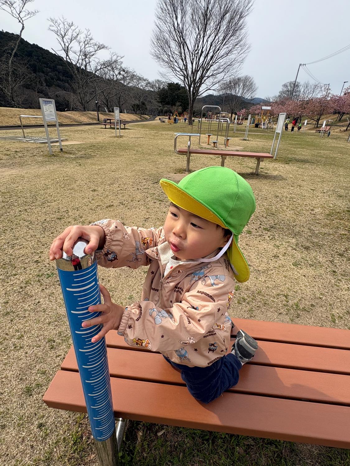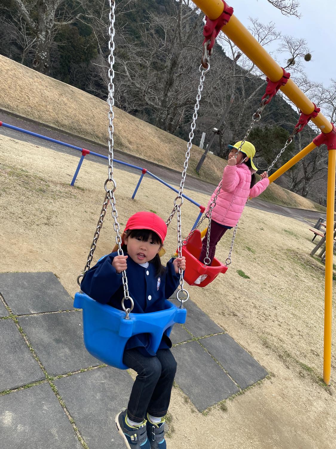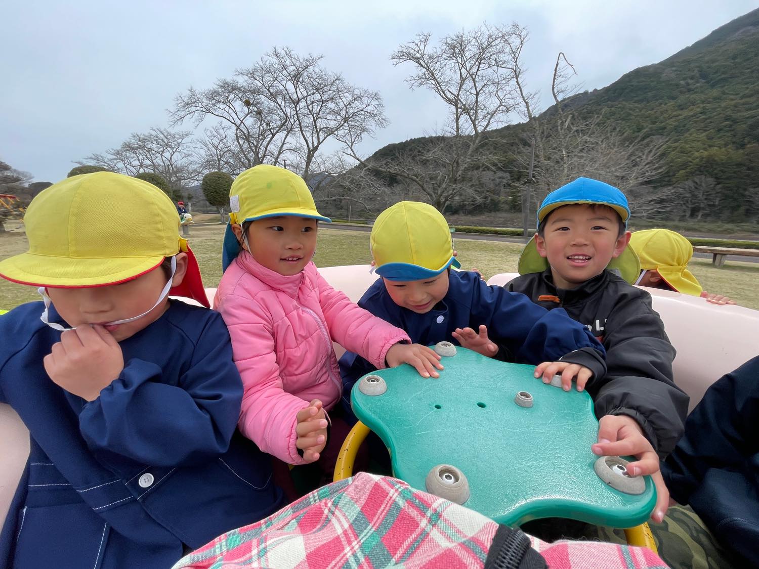 保育園バスにのって、1歳児さんから年長さんまでみんなで「宮リバー公園」へ行きました。曇り空でしたが、子どもたちは元気いっぱいにあちらこちらの遊具で遊びました。