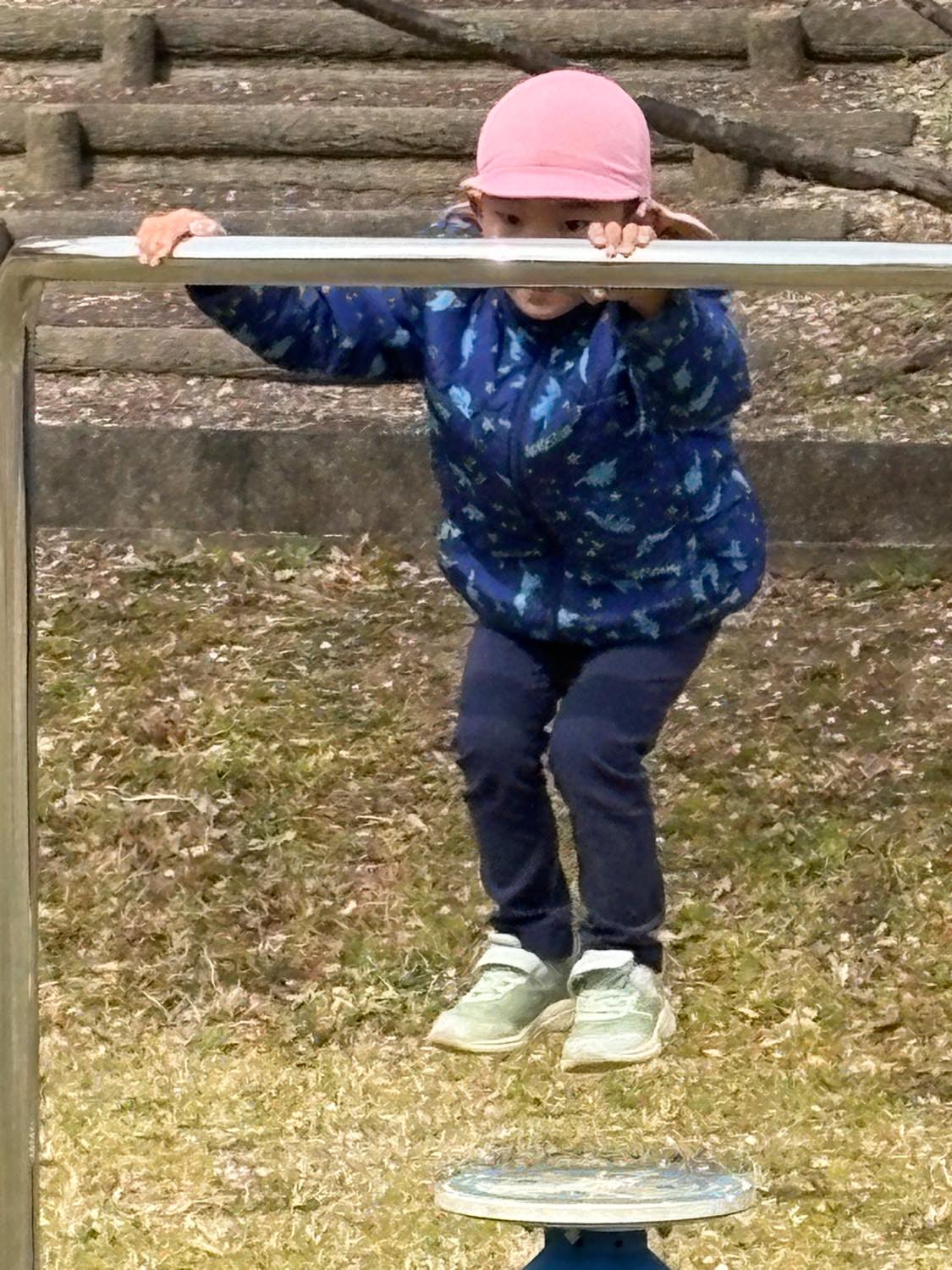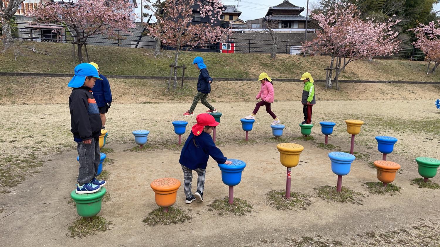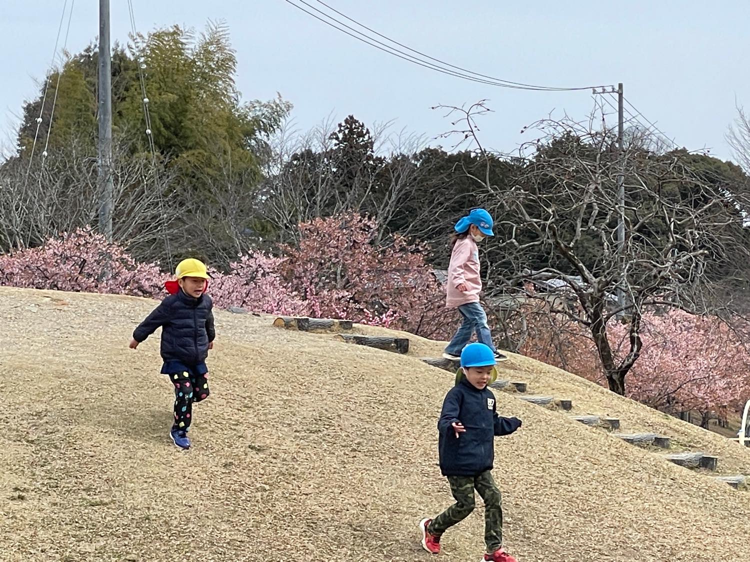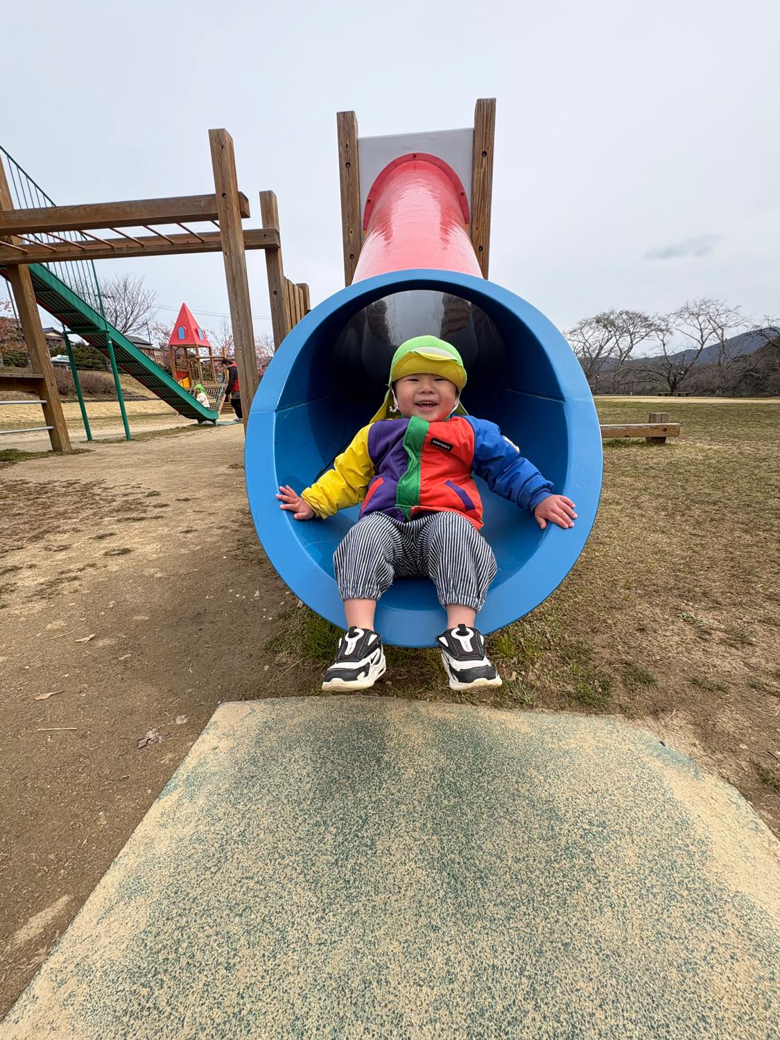 保育園バスにのって、1歳児さんから年長さんまでみんなで「宮リバー公園」へ行きました。曇り空でしたが、子どもたちは元気いっぱいにあちらこちらの遊具で遊びました。