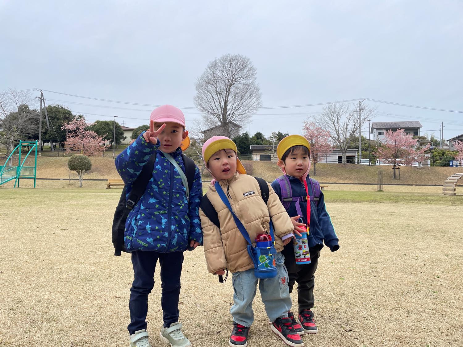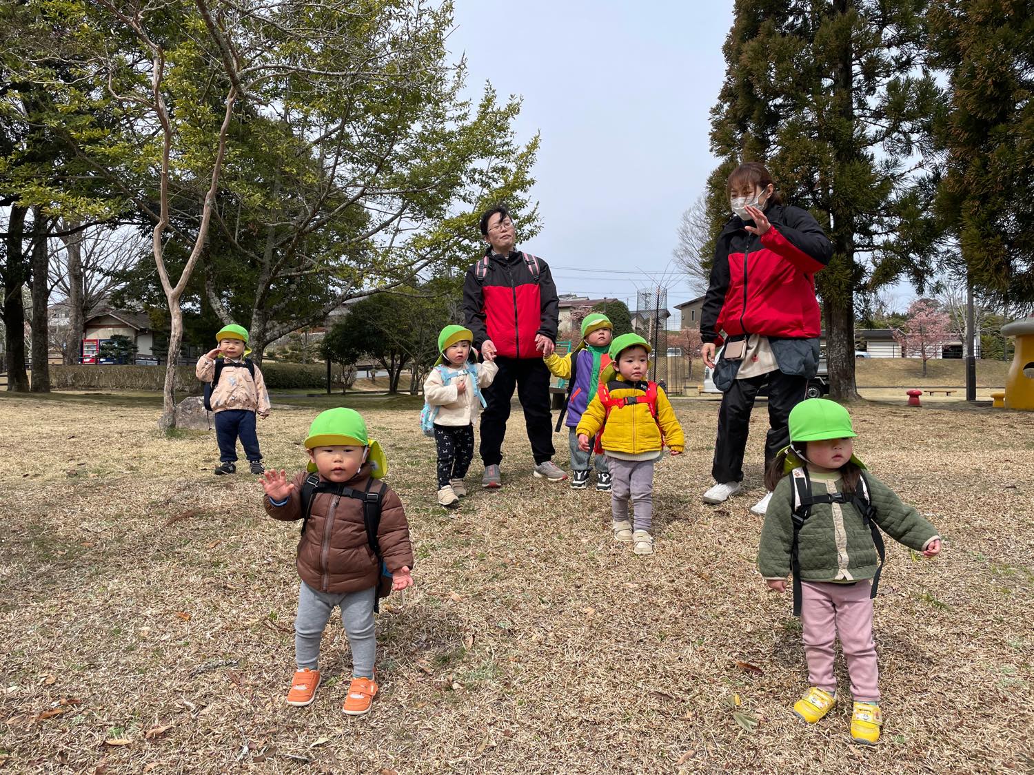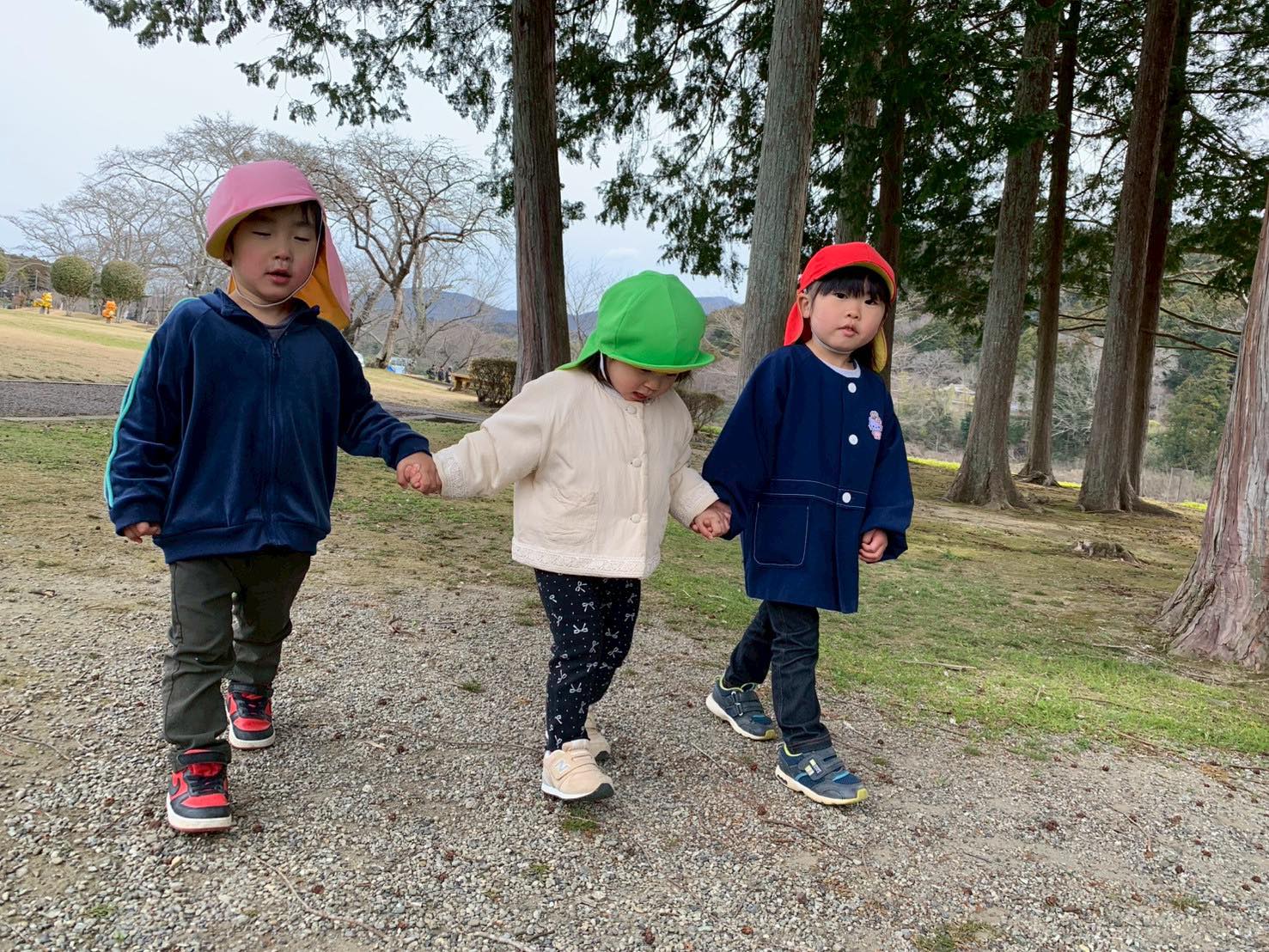 2歳児さんからは、公園でお弁当も食べました。「おなかがすいたので、お弁当たべるわ」という3歳児さん。それにつられて、みんなが「じゃあお弁当にしよう」ということになり準備。自分で敷物をしいたり、お昼ご飯の準備をしたり、、と、頼もしい子どもたちの姿がみられましたよ。できないことがあると、「これあけて〜」と保育士をたよる子の声に反応して「あ!あけてあげる」と大きい子が手をさしのべる様子に感動。一年で、すご〜く成長をしているので、びっくりでした。