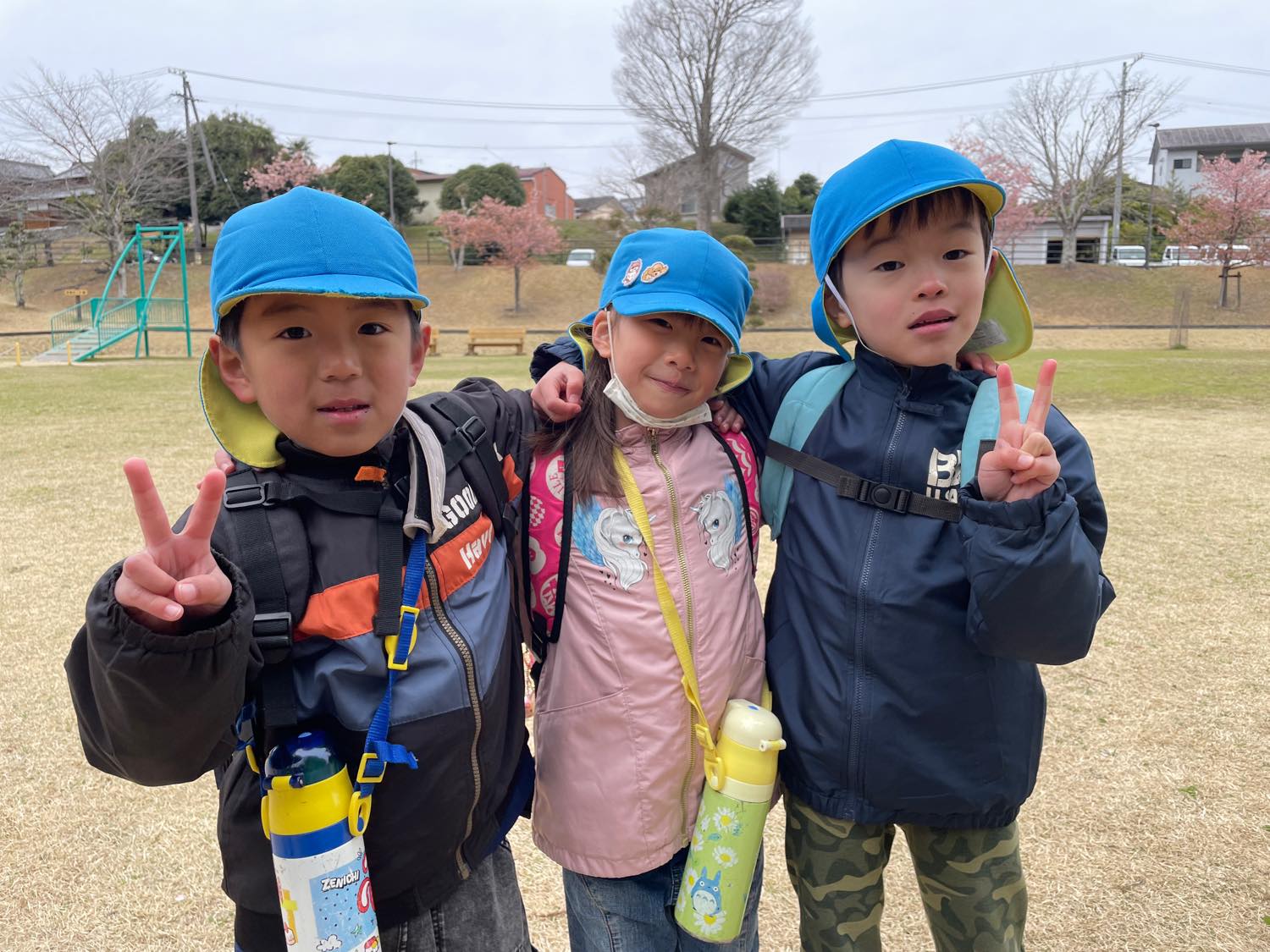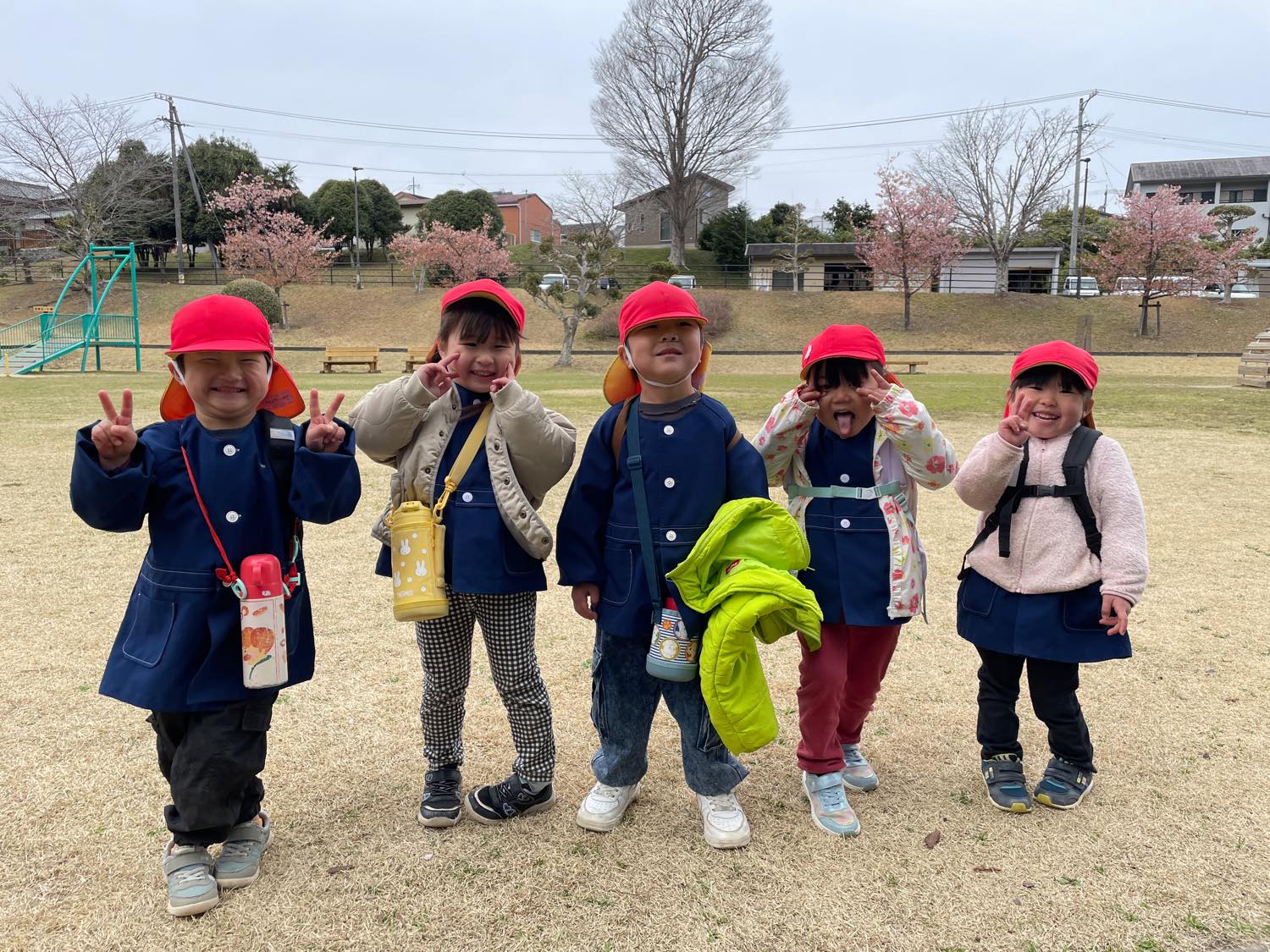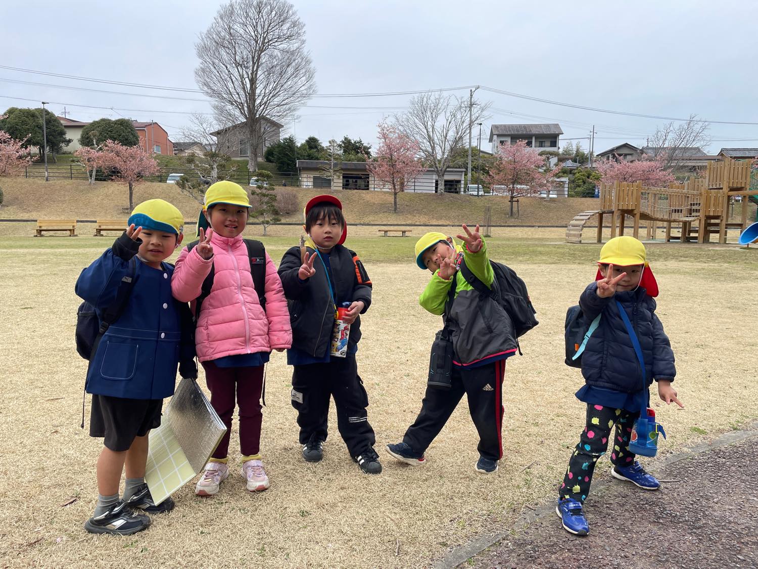 2歳児さんからは、公園でお弁当も食べました。「おなかがすいたので、お弁当たべるわ」という3歳児さん。それにつられて、みんなが「じゃあお弁当にしよう」ということになり準備。自分で敷物をしいたり、お昼ご飯の準備をしたり、、と、頼もしい子どもたちの姿がみられましたよ。できないことがあると、「これあけて〜」と保育士をたよる子の声に反応して「あ!あけてあげる」と大きい子が手をさしのべる様子に感動。一年で、すご〜く成長をしているので、びっくりでした。